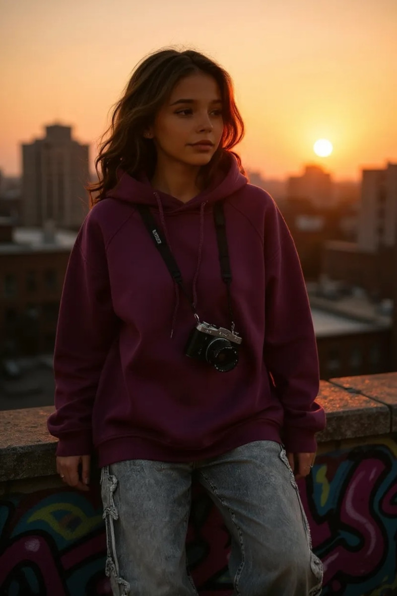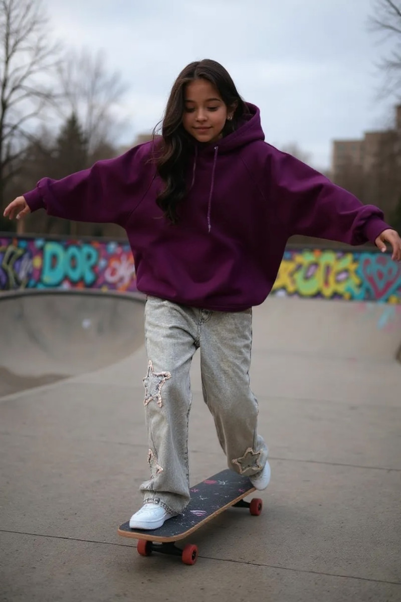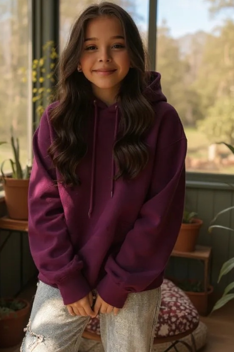 Przedstawiamy wyjątkową bluzę dziecięcą z kapturem, idealną na chłodniejsze dni. Bluza w kolorze fioletowego bakłażanu, wykonana z wysokiej jakości bawełny drapanej zapewnia komfort noszenia oraz ciepło. Bluza o modnym kroju "nietoperza", luzny i wygodny fason, z pogrubionymi lamówkami co nadaje jej unikalny i modny wygląd.