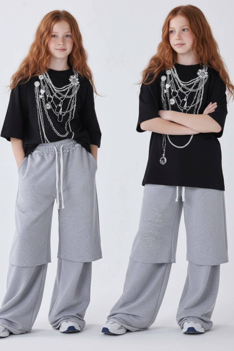 Ultrawygodne, modne i wykonane z bawełny premium, te dresy to must have do szkoły, na miasto i na luzie w domu. Szeroka nogawka i efekt warstwowy (spódnico‑spodni) nadają nowoczesny look, a miękka dzianina zapewnia całodzienny komfort.